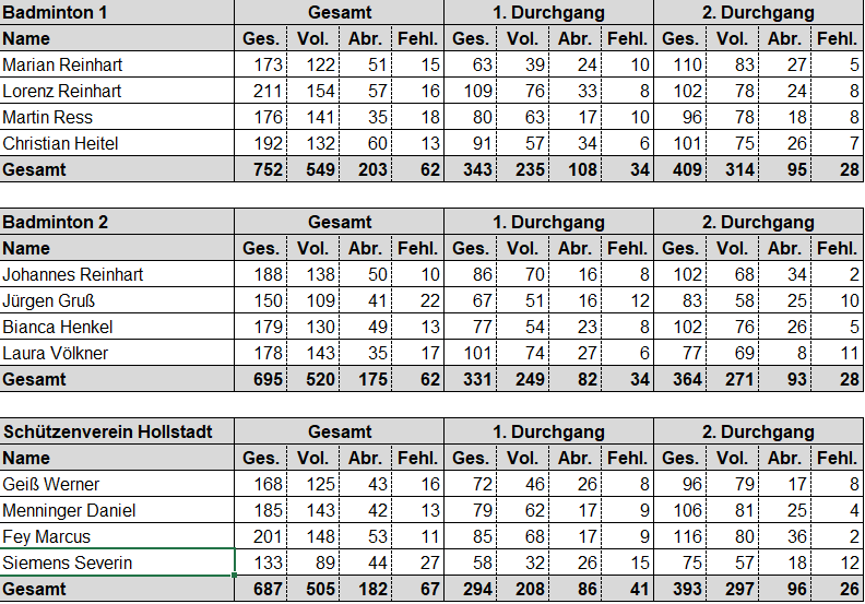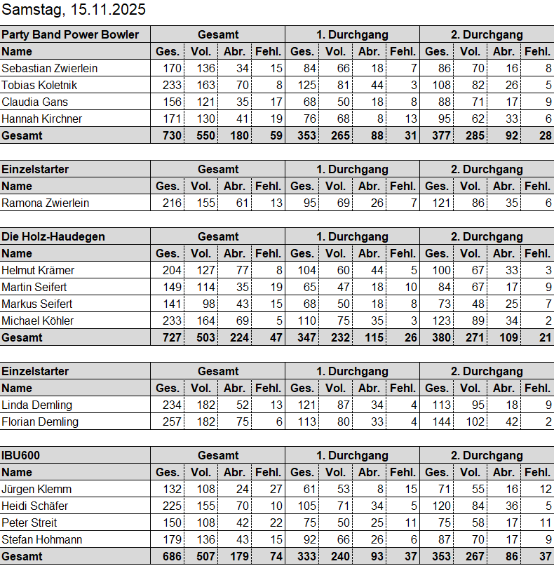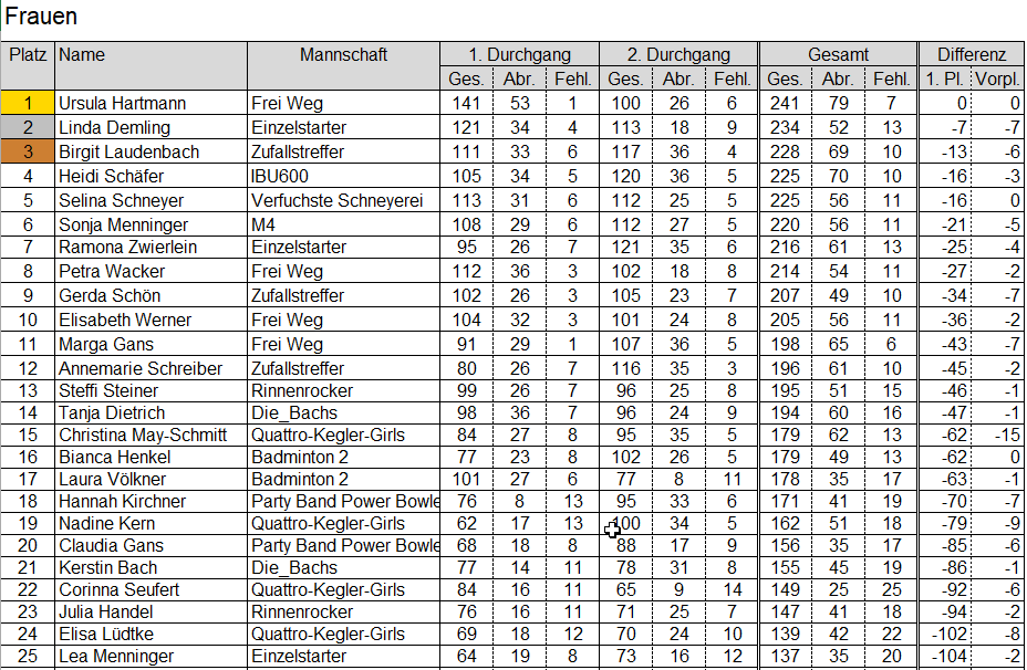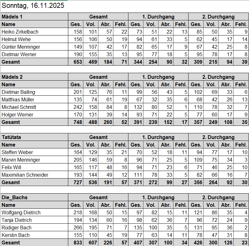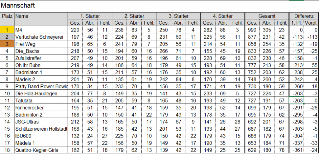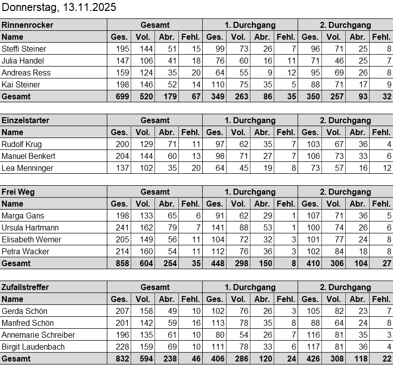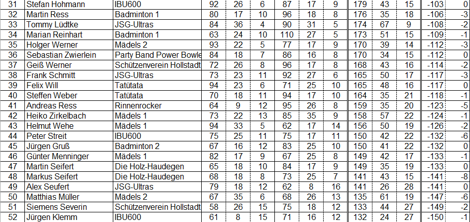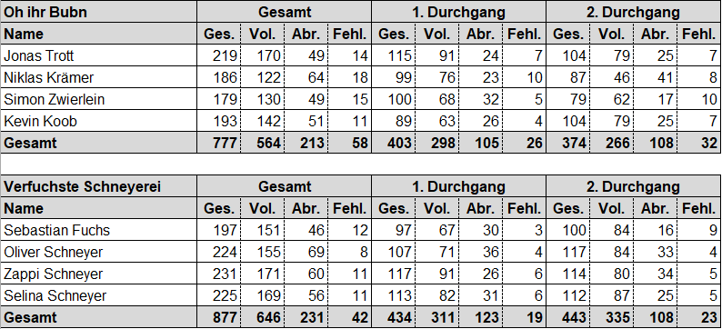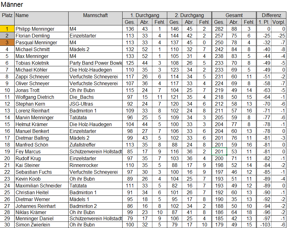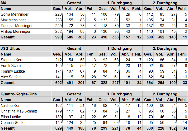 Endauswertung / Endergebnisse der diesjährigen Dorfmeisterschaft im Kegeln: