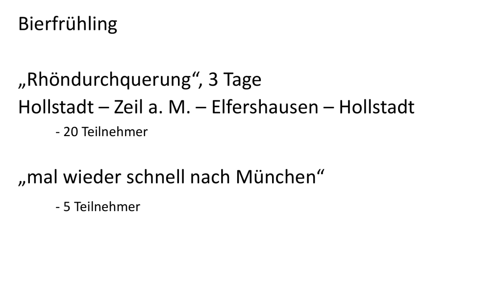 In den Wintermonaten nutzen wir die frei gewordene Zeit bspw. mal für einen Fahrradtechnik-/ Schrauber-Kurs und halten uns bei „Fitness für Jedermann“ an dem „gewohnten Mittwoch“ von 20:15 – 21:15 Uhr in der Sporthalle Hollstadt fit.